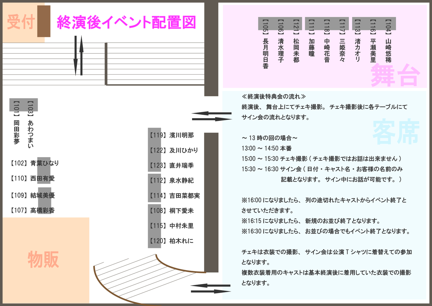 ●公演終了後、スタッフが整列のご案内を致します。ご参加になられる方は、参加券とグッズをお持ちになって、指示があるまでそのまま席でお待ち下さい。